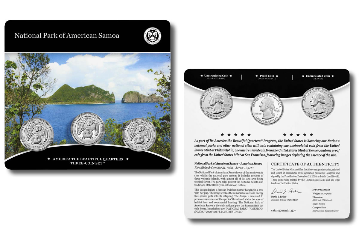 2020 National Park of American Samoa Quarter Three-Coin Sets may be ordered directly from the United Sates Mint’s website page dedicated to America the Beautiful products via this link. Orders may also be placed by calling 1-800-USA-MINT (872-6468).