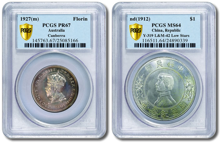 Left: Graded PCGS Secure Plus PR67, this 1927 Australia proof Florin is one of only 400 struck. Right: 1912 China Sun Yet-Sen $1, graded PCGS Secure Plus MS64.