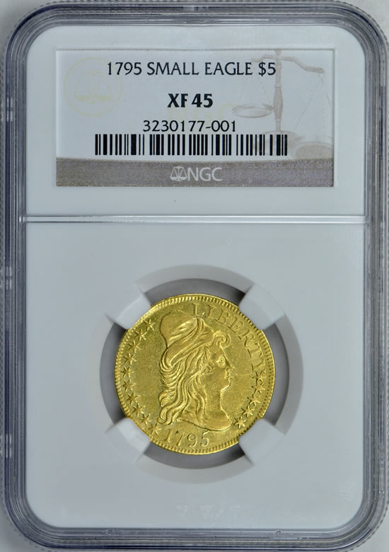 "Another impressive coin is the 1795 Half Eagle (Small Eagle) graded NGC XF-45. Both the Quarter Eagle and this Half Eagle have never appeared in public auction until now."
